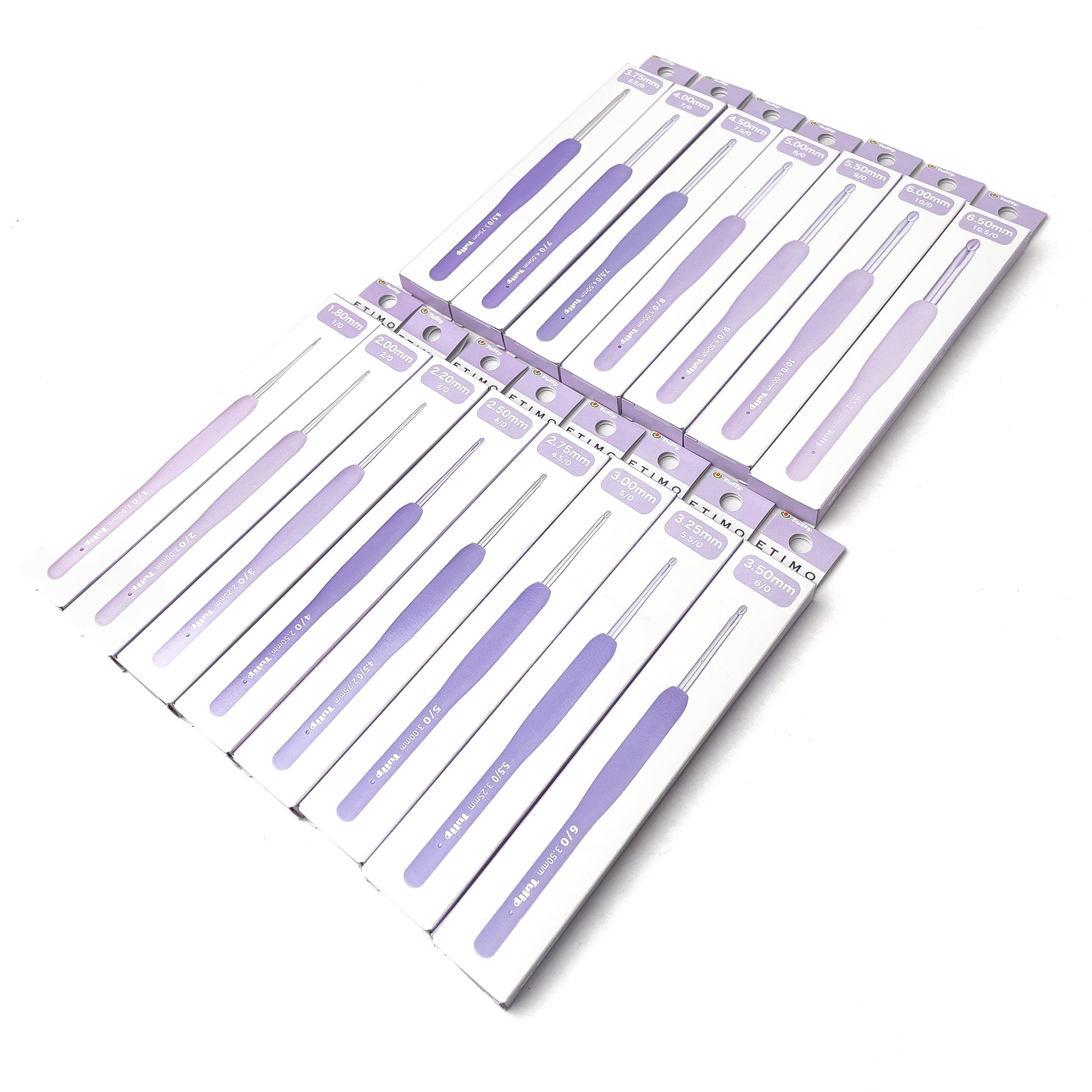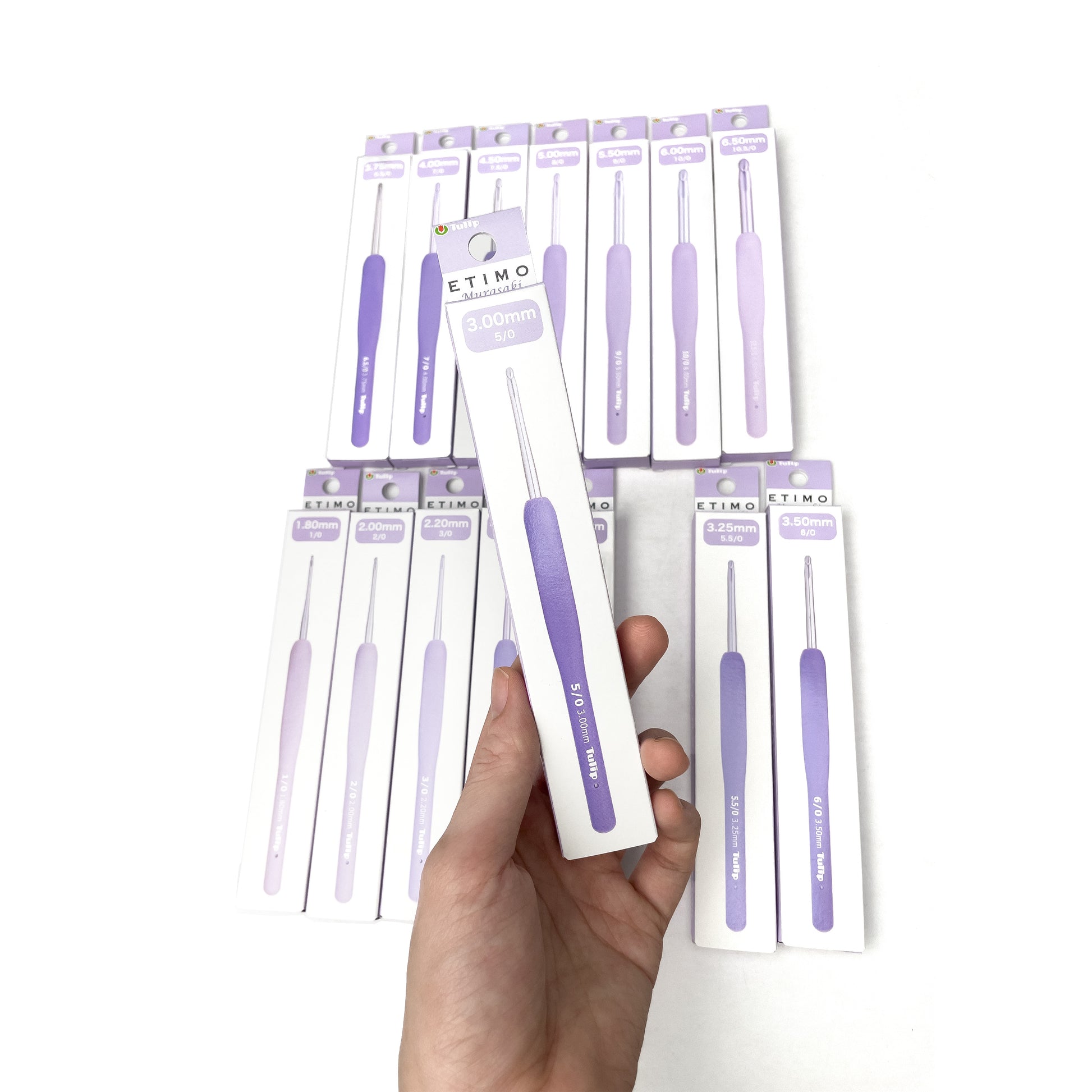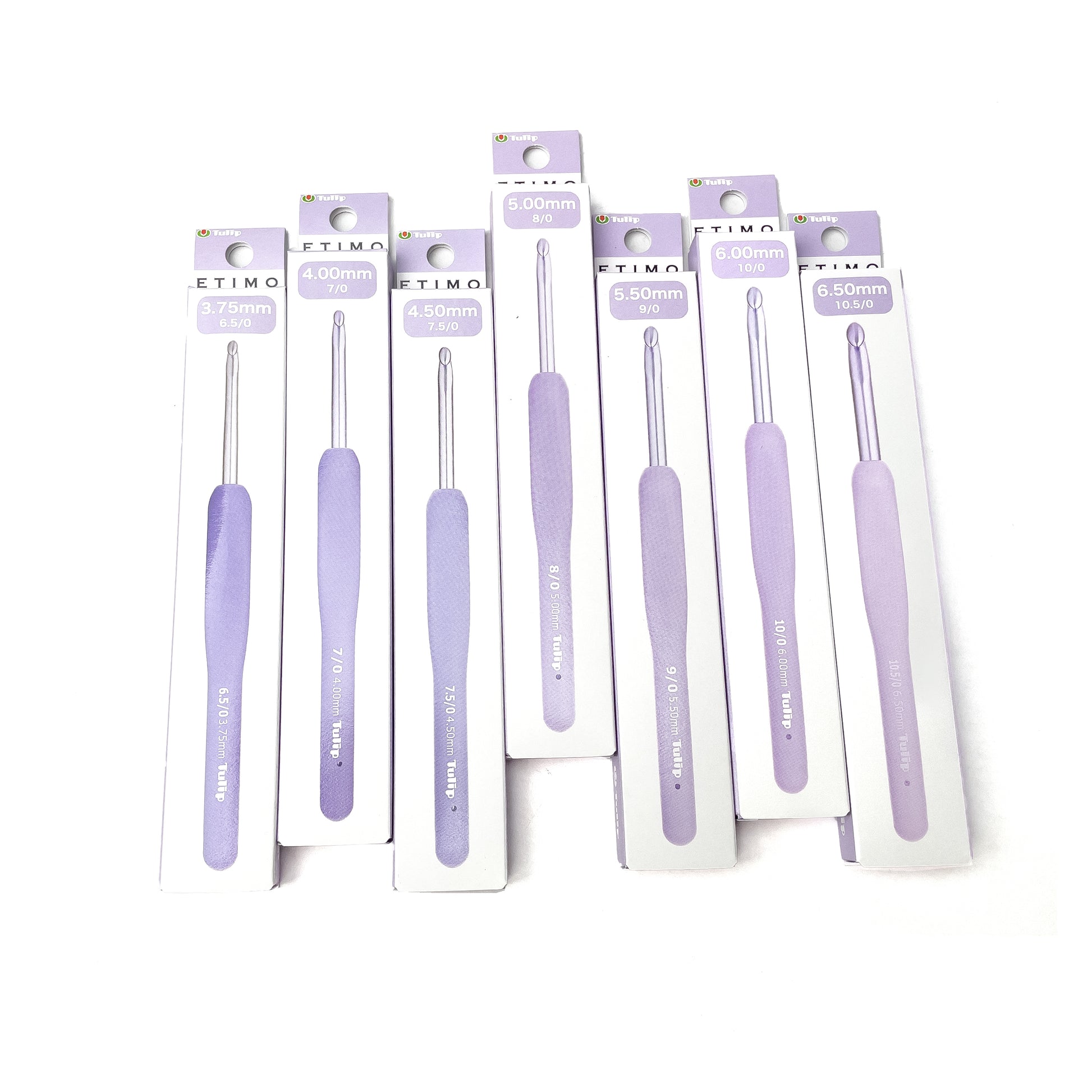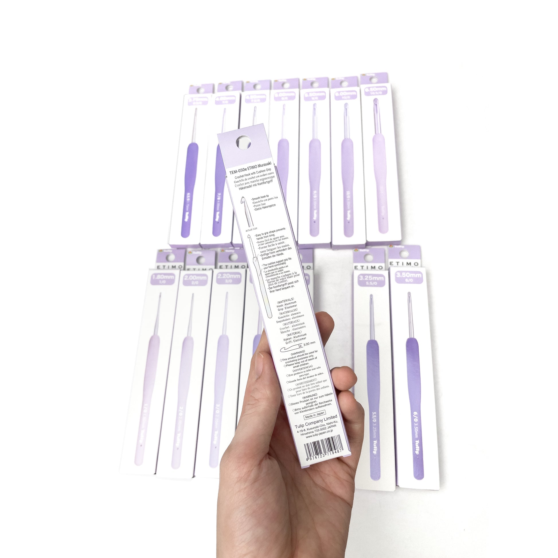 The hooks are shiny pale purple, and the cushion grips are graduated so that you can fully appreciate the color spectrum. This embodies our hope that you will enjoy an enriching crocheting experience. The hook features not only visual beauty but also inherits the character of ETIMO that purses smooth crocheting.